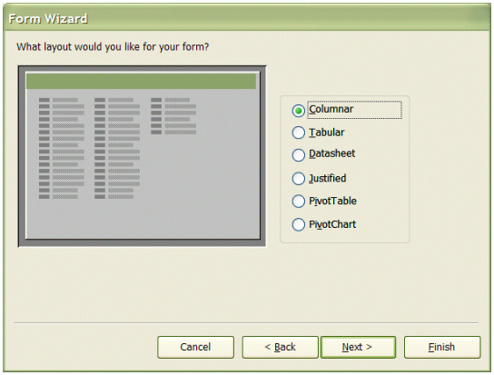 3. Access gives you a lot of options with respect to the way you want your form to display the data. To keep things simple, I selected Columnar. You could create richer and more complex forms with this Wizard by selecting other options (like PivotChart).