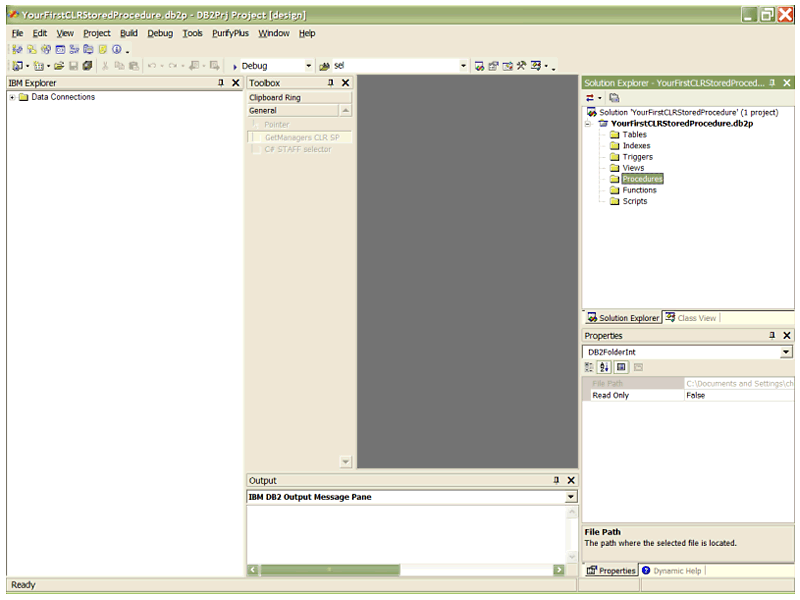 Once you’ve created a DB2 UDB database project, your Visual Studio .NET integrated development environment (IDE) looks similar to the following figure: