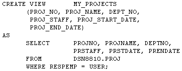 Or perhaps you need to implement security at the row level. Consider a table that contains project information. Typically this would include project name, purpose, start date, and who is responsible for the project. Perhaps the security requirements of the projects within your organization deem that only the employee who is responsible for the project can access their project data. By storing the authorization ID of the responsible employee in the PROJECT table, a view can be created using the USER special register such as the one shown below: