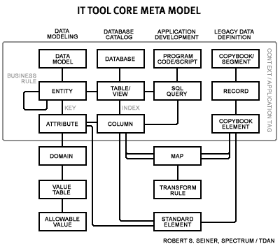 The metadata in the database catalog is central to the Core Meta Model displayed in Figure 1. The databases, tables / views of data, indexes, and the columns (represented as metadata types on the diagram) are vital links (or the Hub) in the definition of metadata to support the enterprise. Without DBA metadata, there is no connection between the business definition of the data (in the data model) and the data. Without DBA metadata, there is no map / relationship between source and target data. Without DBA metadata, there is no connection between the SQL and the data. Without DBA metadata, the enterprise structure of metadata (at the technical level) does not exist.