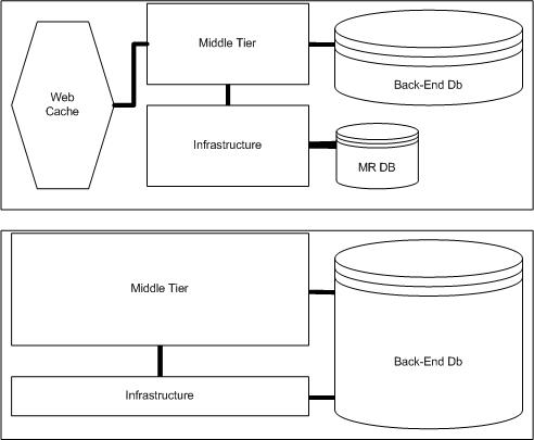 One advantage of the three-server configuration is that each tier can be tuned independently. I still consider the three-server configuration constrained because high availability and load balancing cannot be implemented, and each server is a single point of failure in the system. Again, I would recommend that the Metadata Repository be installed in the back-end database. In fact, depending on the application versus database load, you may want to install the entire infrastructure on the server with the back-end database.