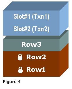 Then another transaction, Txn2, updates the row Row2 and wants to lock the row. However, there are no more slots in the ITL available to service the transaction. The MAXTRANS entry is 11, meaning the ITL can grow up to 11 slots and the block has empty space. Therefore, ITL can grow by another slot and Slot number two is created and allocated to Txn2 (refer to figure 4).
