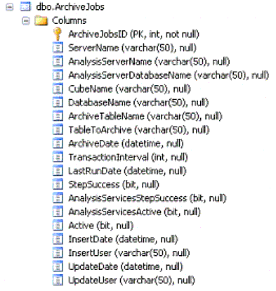 The ArchiveJobs table contains key columns and data that will provide adequate data to facilitate entity creation and data migration for the archive process. This archive process was designed to fit into multiple instances of a data warehouse, as well as other data warehouses, assuming they were constructed in a similar fashion as the environment depicted in figure 1.1. Additionally, this entity is designed to support other processes, such as an archiving solution for Analysis Services. Figure 1.3 depicts the ArchiveJobs table structure.